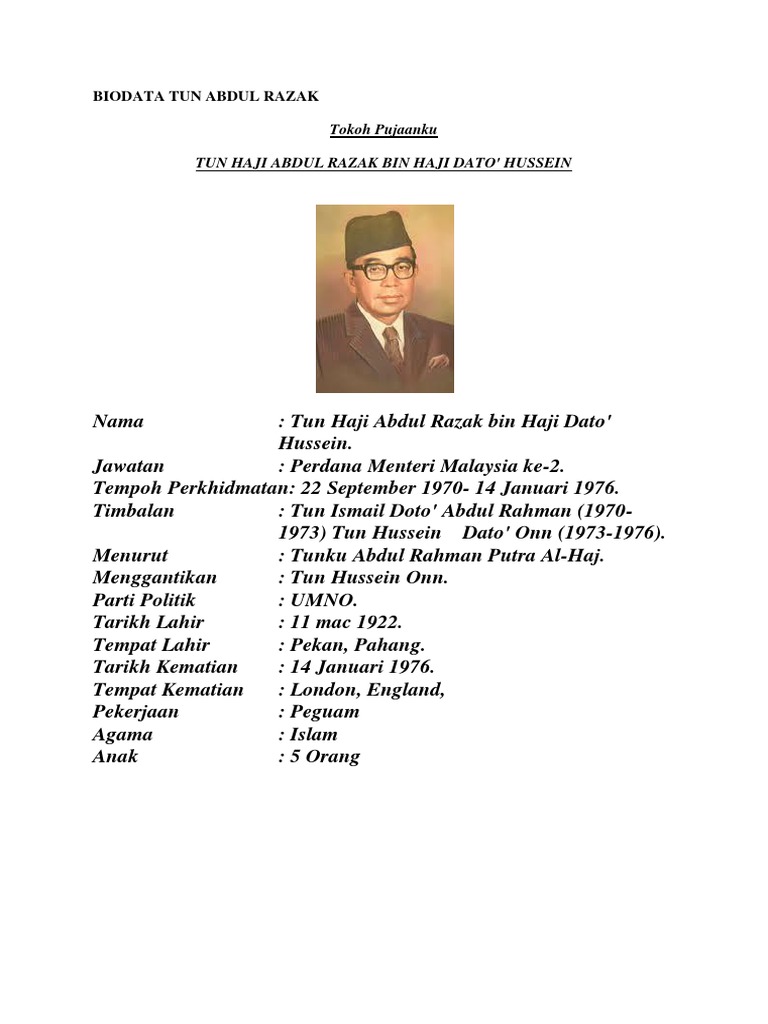 Beliau terkenal dalam pelancaran Dasar Ekonomi Baru DEB. LATAR BELAKANG TOKOH NEGARAWAN TUN ABDUL RAZAK Tun Haji Abdul Razak bin Dato Hussein merupakan Perdana Menteri Malaysia yang berkhidmat dari tahun 1970 sehingga 1976. Zainul Abidin bin Mohd.